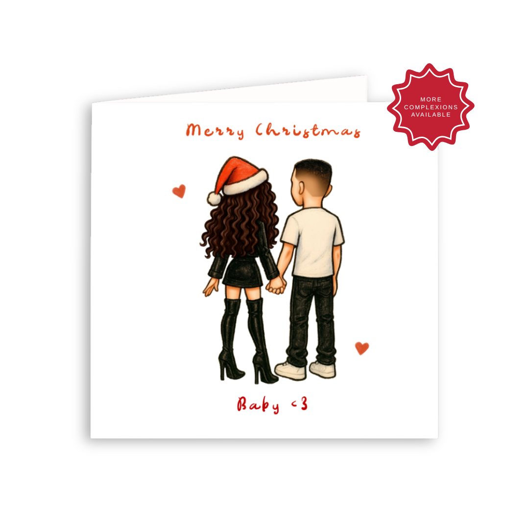 A cute and romantic Christmas card featuring an illustrated couple, perfect for gifting to your partner. Personalise the name to make it special and unique to your relationship.